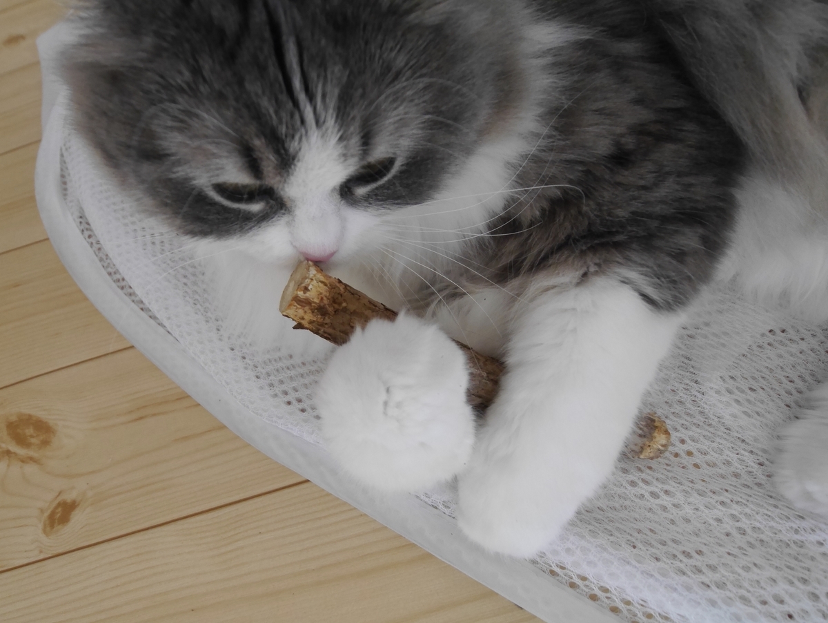 2020-04-16 またたびの木 ナラちゃんが最近ベッドをかじるようになりました。 無垢木材の木なのでガジガジになってしまい・・・ しまいにはそれを食べている様子_:(´ཀ`」 ∠):」ヤメテーー ネットで調べるとまたたびの木がいいと書いてあったので さっそく買いにいきました♪♪ 木をあげるとさっそくシピナラ酔っちゃってほわわわーん。 意外にも警戒心の強いシピの方が気に入ったみたい。 そしてすぐに飽きる2人・・あれ・・・ ナラちゃんは今日もベッドをかじるのでした。。